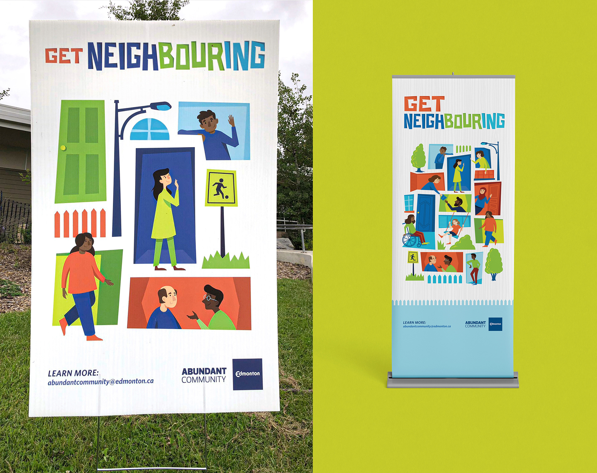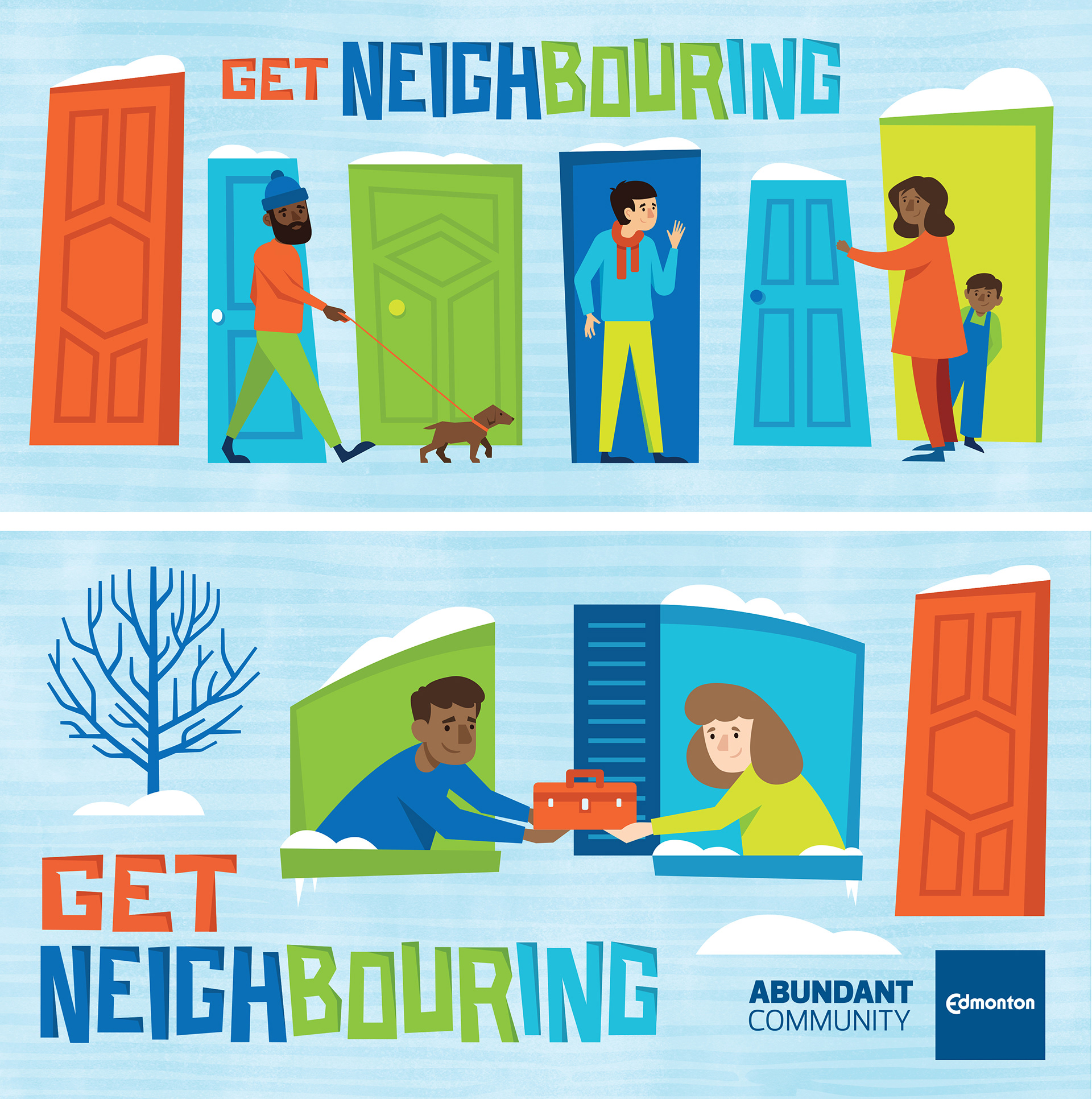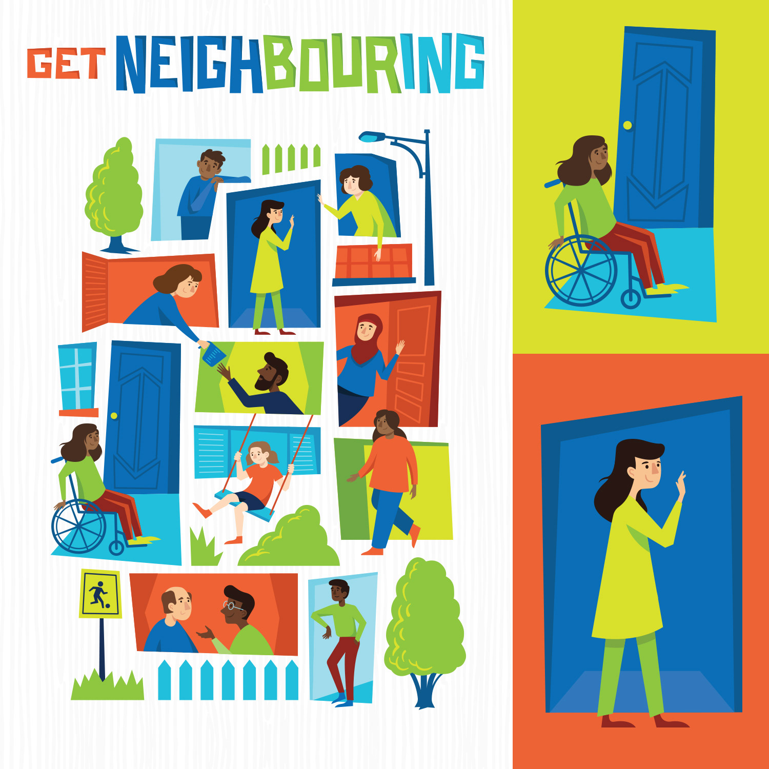 The illustration assets I developed were created to be modular and be easily assembled in a variety of ways to fit the many use cases of the campaign. Inspired by overhead views of neighbourhood blocks and the idea of a colourful community mosaic. I wanted to visualize the idea of reaching beyond the walls of your own home and connecting with your neighbours.
