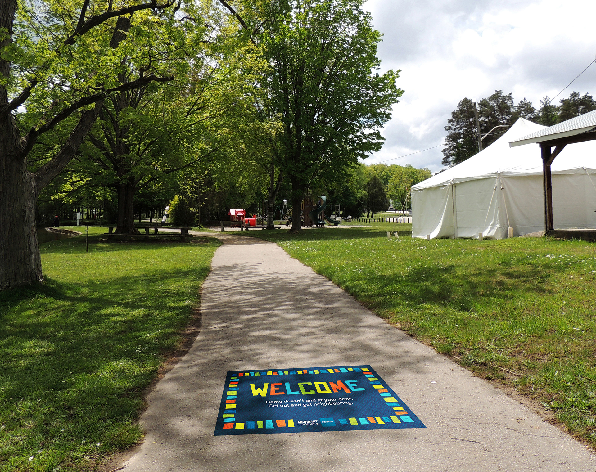 An out-of-home environmental advertisement was placed on sidewalks in participating neighbourhoods. The implementation and messaging on the advertisement were meant to resemble a welcome mat, presenting the entire community as a home with an open door for people to come together as neighbours.