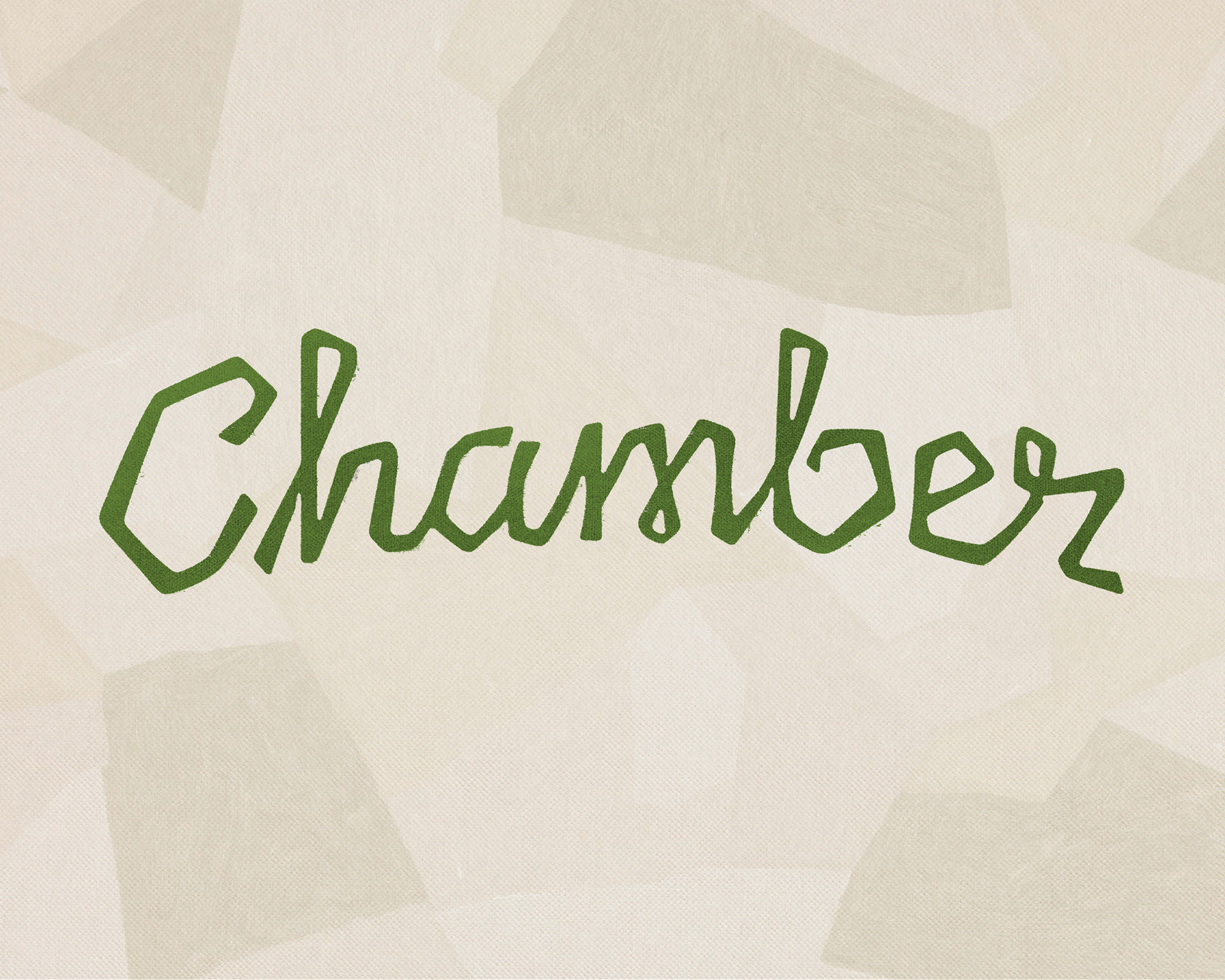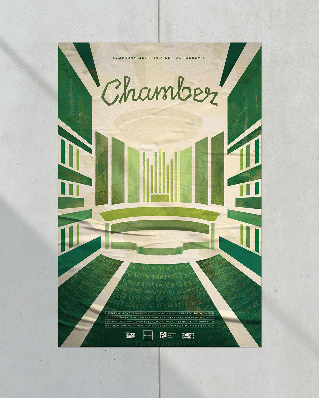 The concept for the poster was to take the architecture of a concert hall, the Winspear Centre (where the Chamber Music Festival is usually held), and visually pull it apart/socially distance the elements. With indoor performances not possible, musicians perform in empty venues and ‘plein air’ with the natural landscape becoming their audience. Architectural planes on the poster are filled with impressionist paintings in a spectrum of lush greens. The title design of 'Chamber' and the musician credits use custom angular script lettering that resembles energetic musical notation.