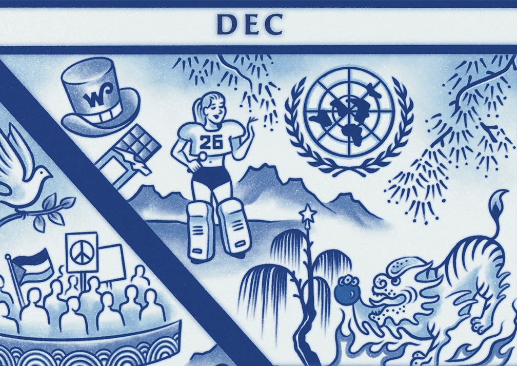 I hope you enjoy discovering all the references within this fourth annual ‘Year in Review’. Each year’s illustrated calendar is inspired by a specific period in art history as a way to visually associate the past 12 months within the history books. This year is inspired by Chinese blue and white pottery from the 16th century. All the events are organized across a rectangular calendar in the way I mentally picture the year. Sometimes called ‘calendar synesthesia’, this neurological phenomenon affects how people’s visual pathways are stimulated when thinking of the months of the year. I’ve chosen to highlight important global and national moments that represent the highs and lows of the year, from geopolitical affairs, to pop culture phenomena. For more information on the background of this project please visit my 2020 blog post.