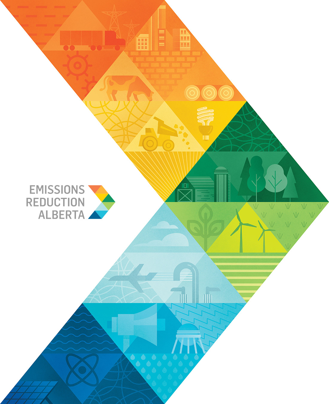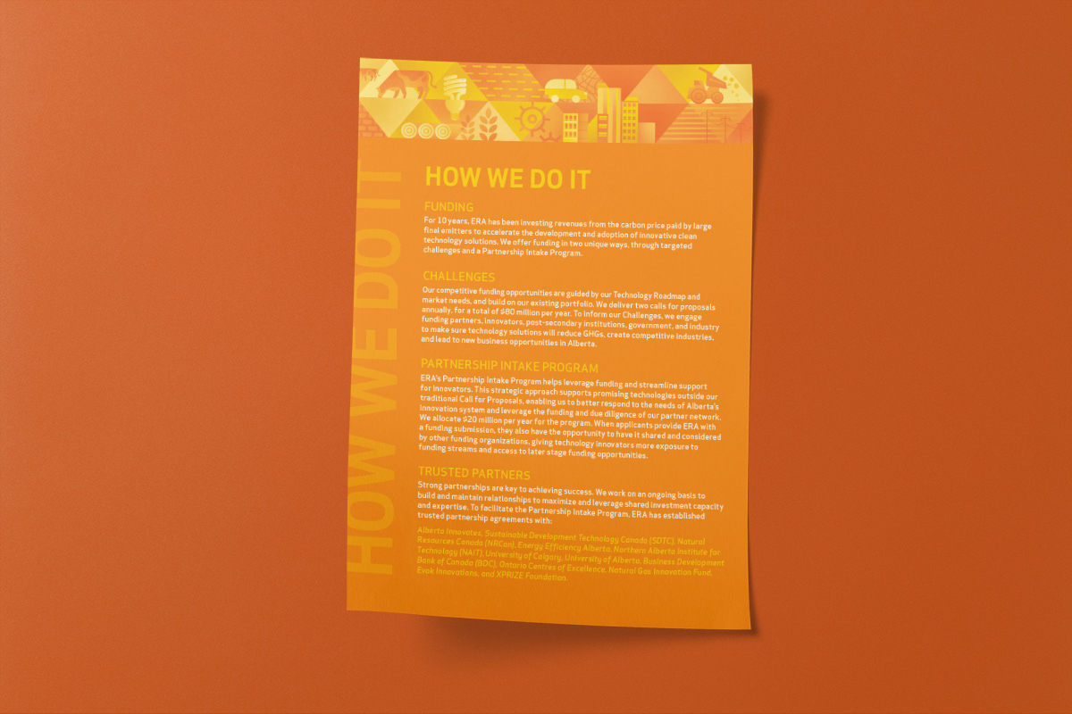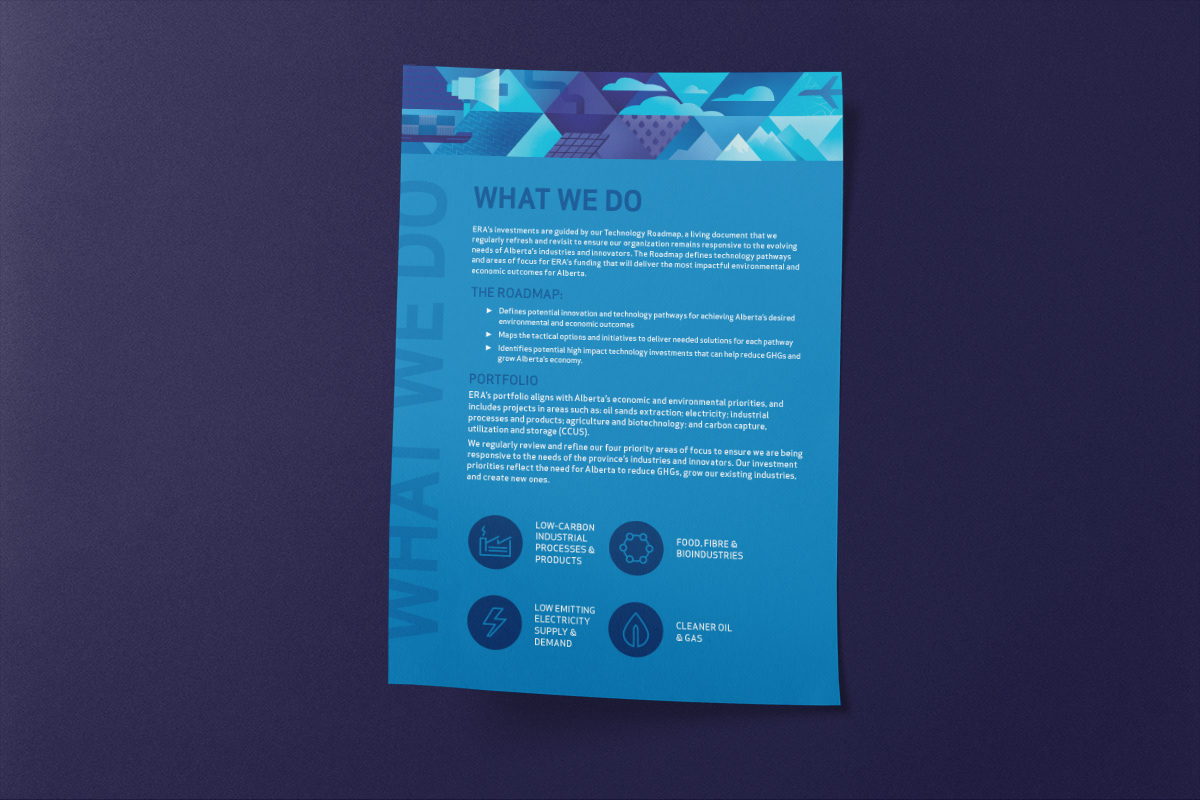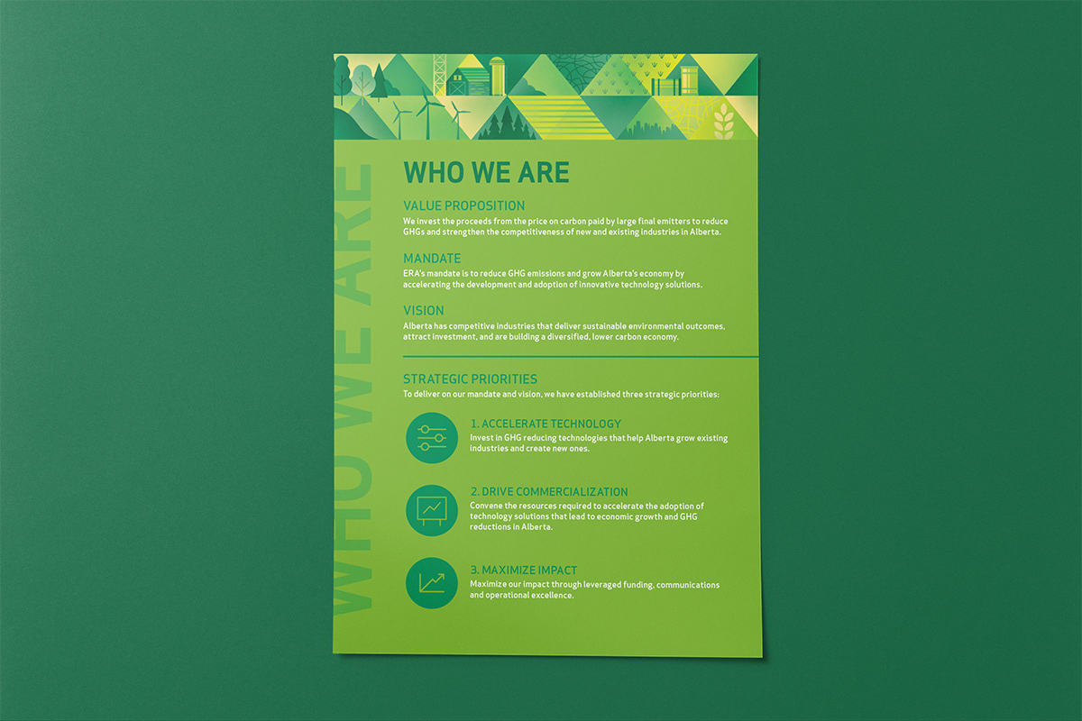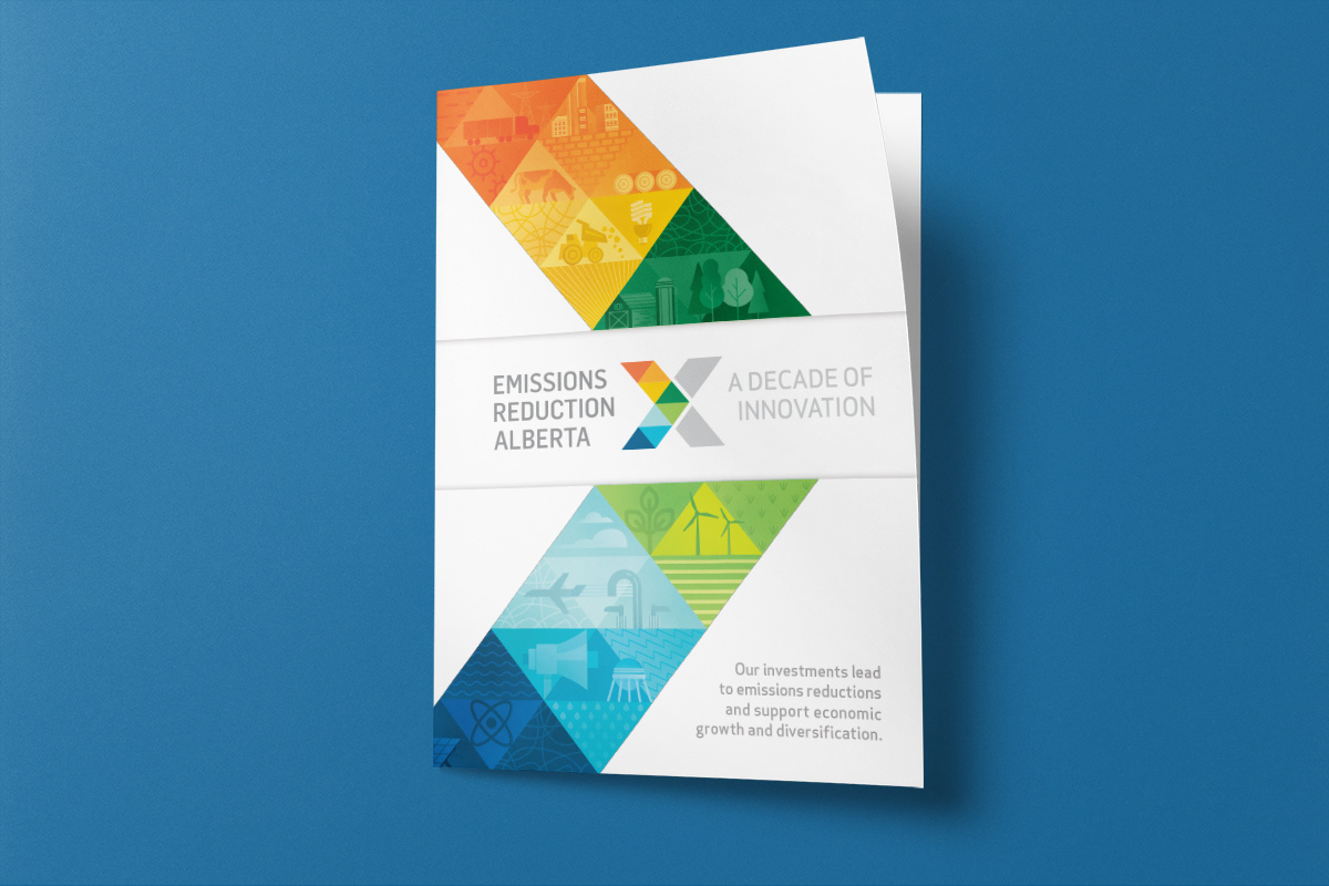 Expanding upon the existing visual identity of Emissions Reduction Alberta, the creation of a primary brand graphic allows for the unique work of ERA to be communicated visually when it is applied to various brand documents and environments. The client's work investing in technologies that reduce greenhouse gas emissions spans many different sectors. Playing with a spectrum of colour, the graphic highlights these symbols of technology, industry, energy, emissions, and the environment. Placed against a triangular grid, the image builds upon an existing visual language of ERA and incorporates more narrative elements. The breadth of the graphic makes it ideal to crop into to create different colour schemes and provide variation to the diverse print needs of the organization. In addition to installing a floor-to-ceiling mural in their office and boardroom, the graphic has served on print promotion pieces, web graphics, and trade show displays.