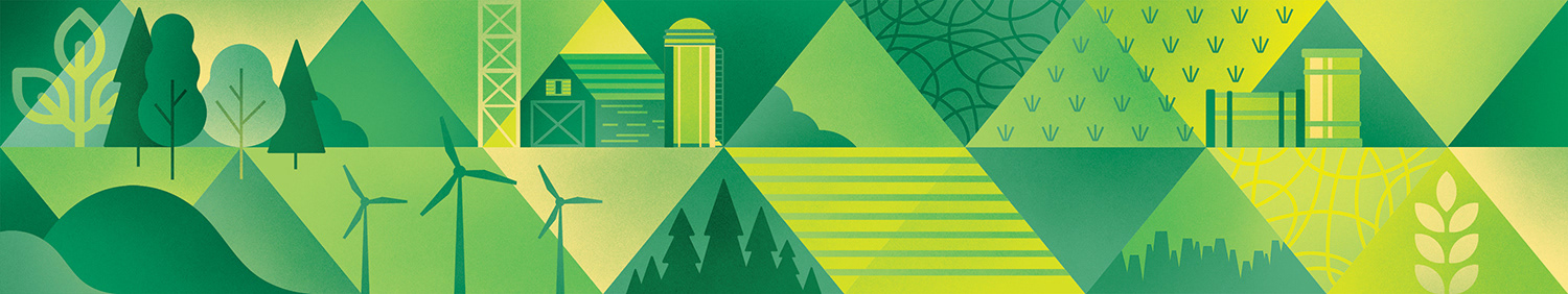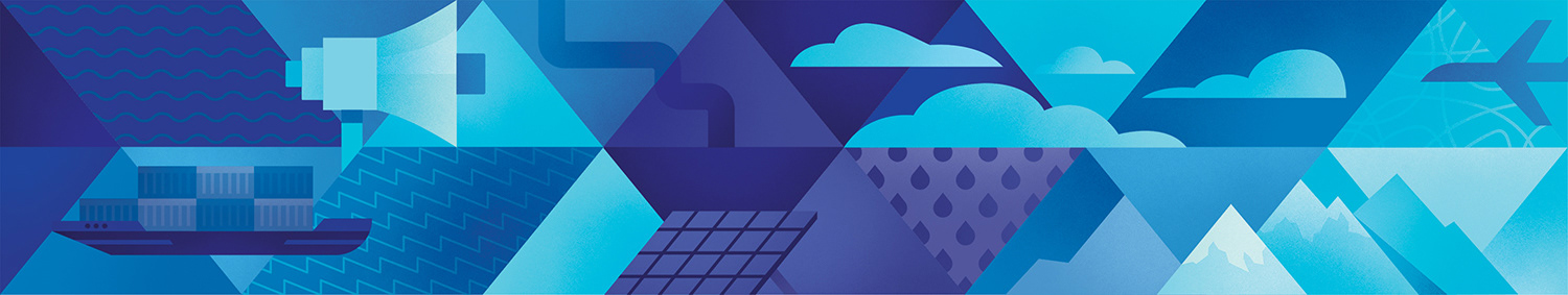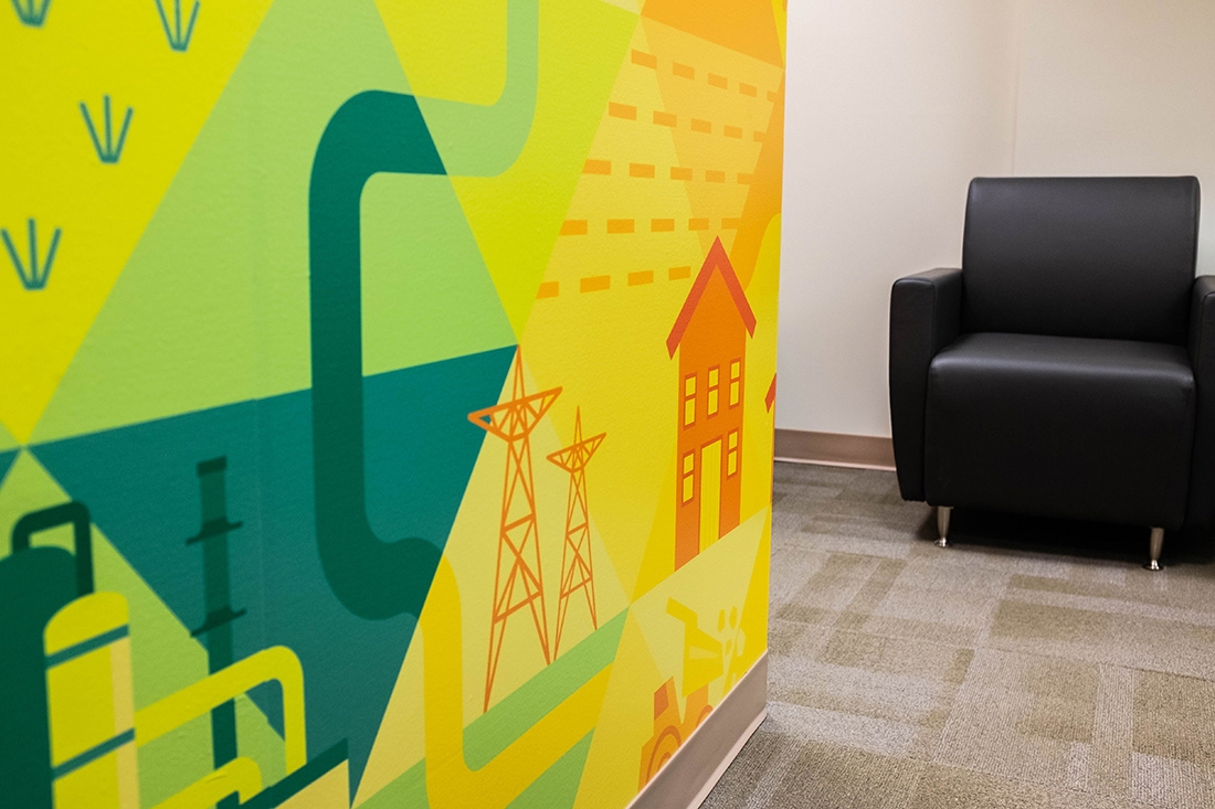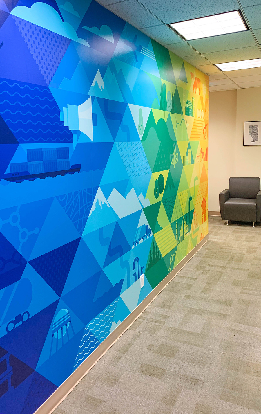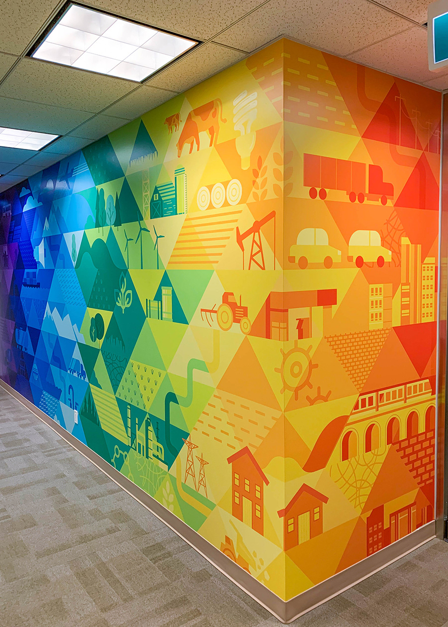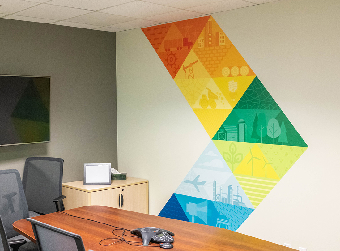 Expanding upon the existing visual identity of Emissions Reduction Alberta, the creation of a primary brand graphic allows for the unique work of ERA to be communicated visually when it is applied to various brand documents and environments. The client's work investing in technologies that reduce greenhouse gas emissions spans many different sectors. Playing with a spectrum of colour, the graphic highlights these symbols of technology, industry, energy, emissions, and the environment. Placed against a triangular grid, the image builds upon an existing visual language of ERA and incorporates more narrative elements. The breadth of the graphic makes it ideal to crop into to create different colour schemes and provide variation to the diverse print needs of the organization. In addition to installing a floor-to-ceiling mural in their office and boardroom, the graphic has served on print promotion pieces, web graphics, and trade show displays.