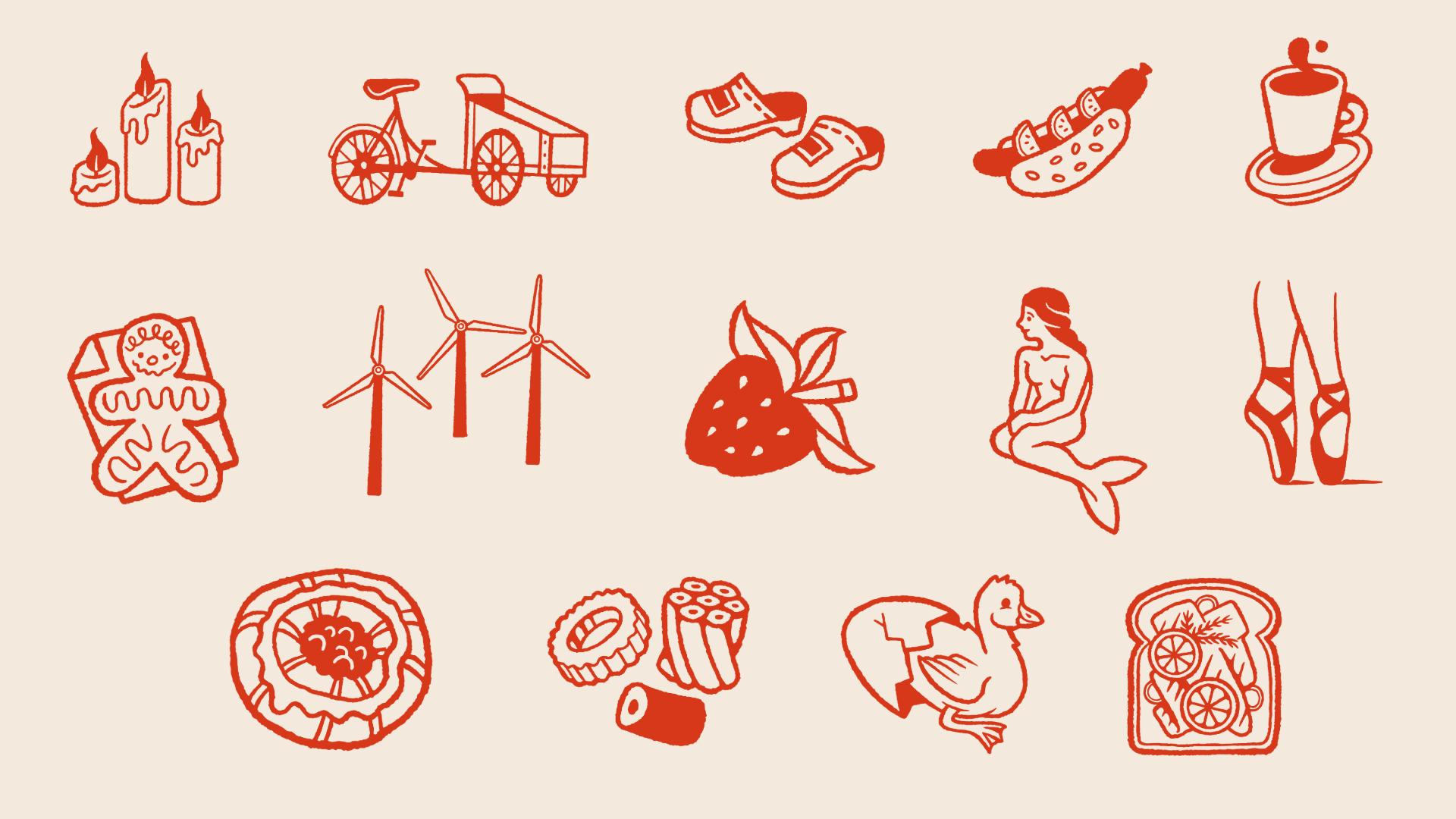 Top to Bottom (L-R): Candles, Christiania Cargo Bike, Danish Clogs, Danish Hot Dog, Kaffe, Kagemand, Wind Turbines, Strawberry, The Little Mermaid, The Red Shoes, Spandauer, Liquorice, The Ugly Duckling, Smorrebrod