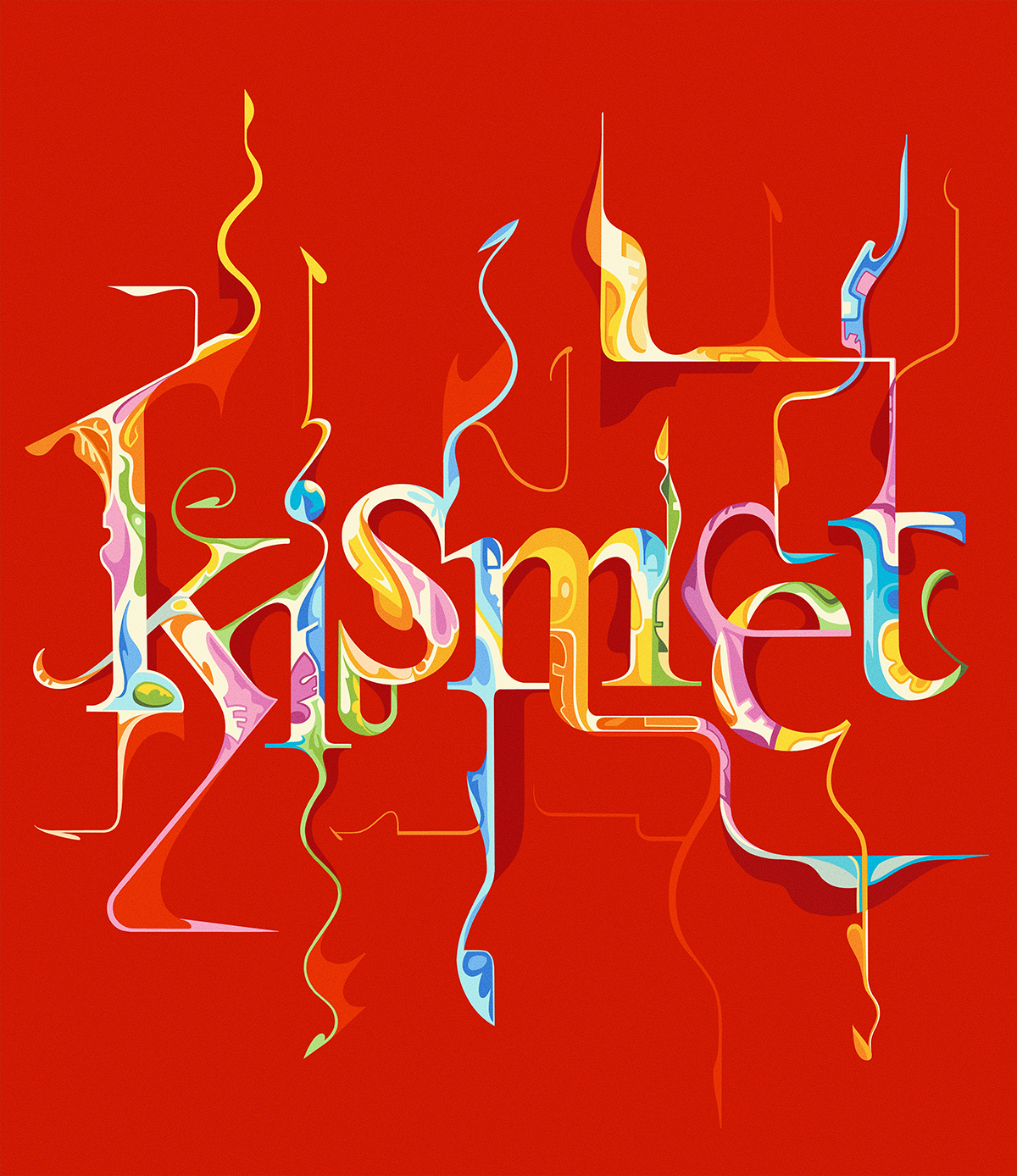 This piece takes inspiration from one of my favourite artists, Alex Janvier. His intricate, sinuous painted lines feel like they compose a dream world rich with the most pleasing of colours. His unique visual language felt like the perfect illustration of the word kismet. A beautiful word (meaning fate/destiny) I hope I did justice with these converging lines and ligatures of fate.