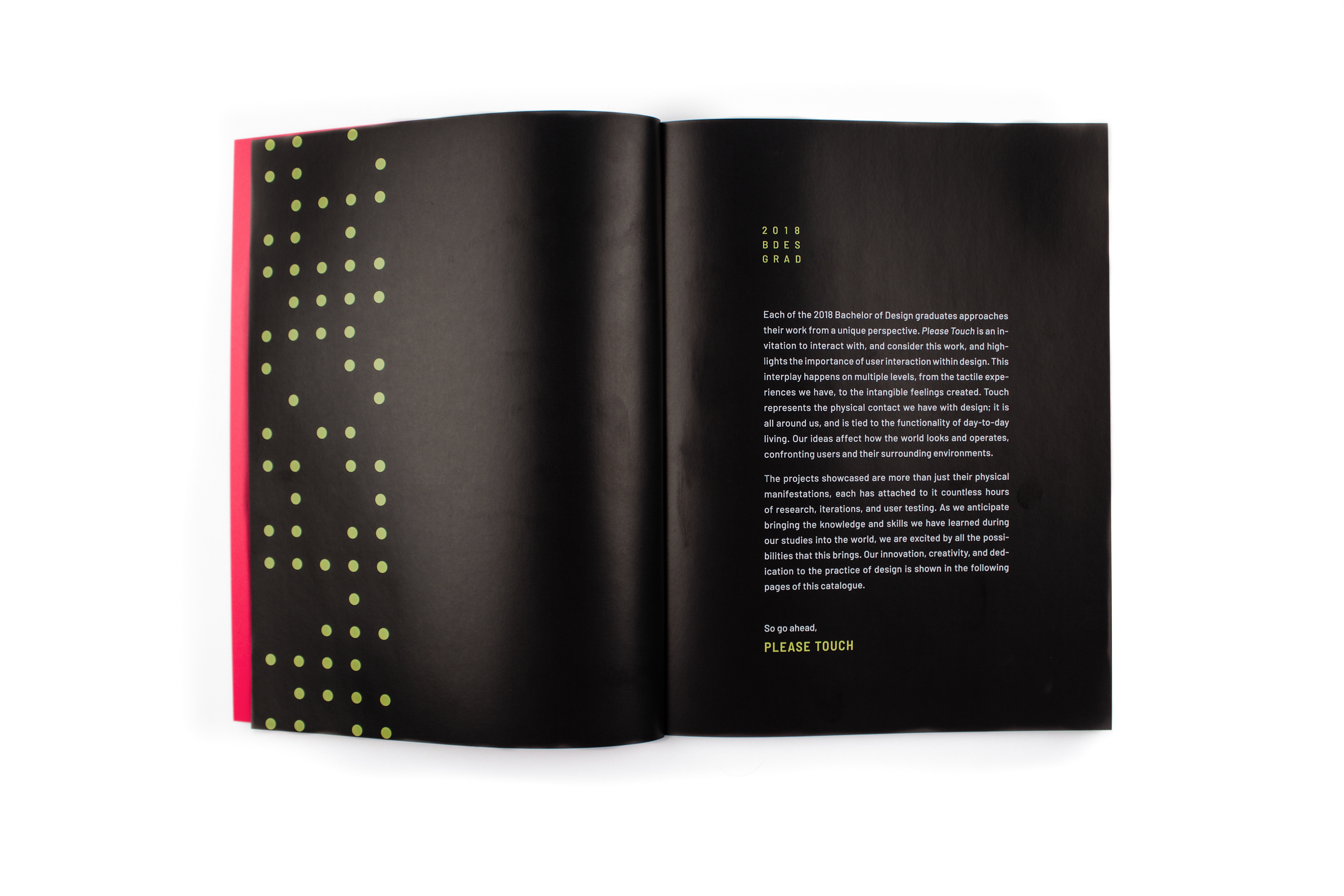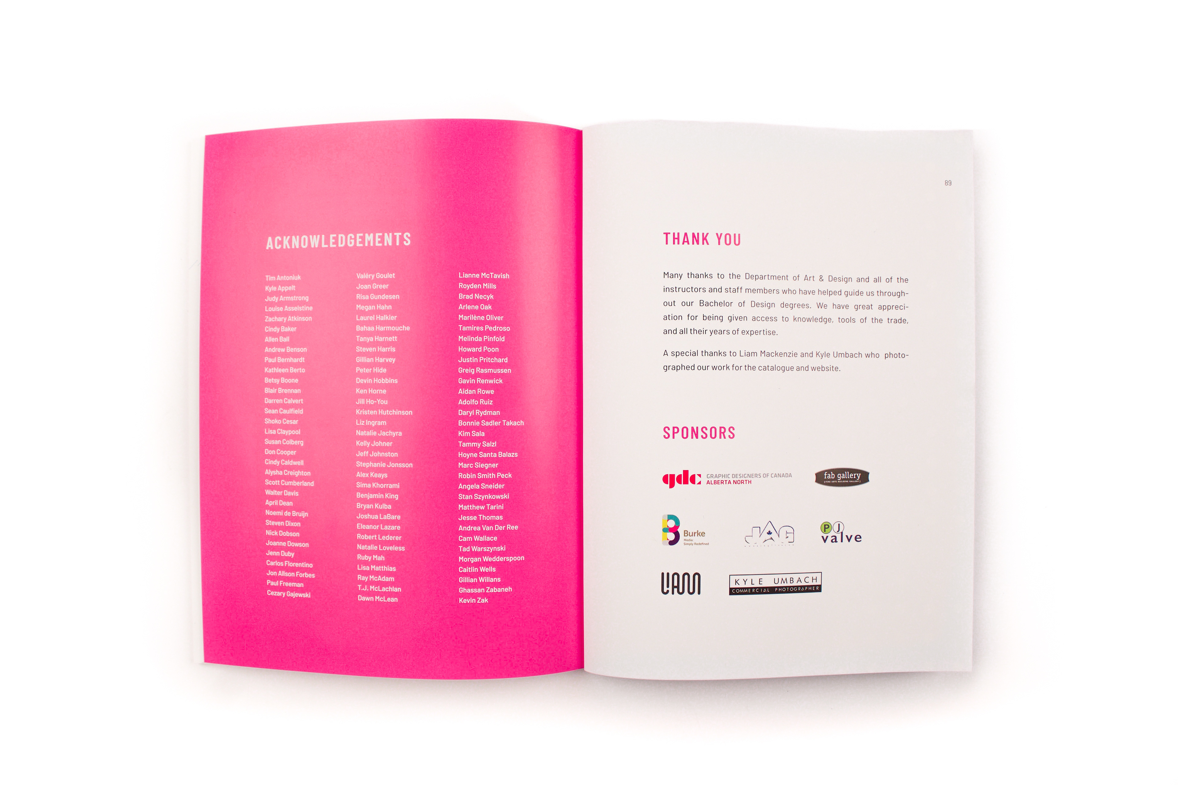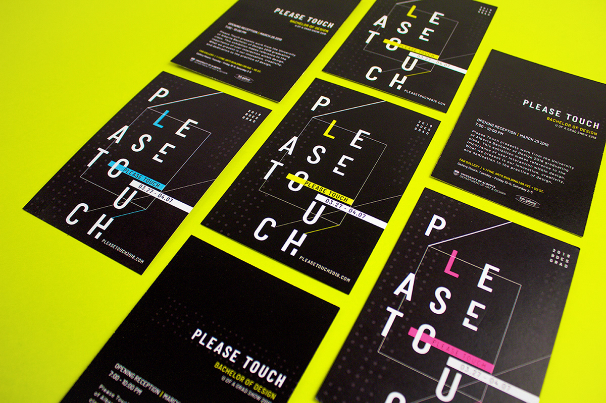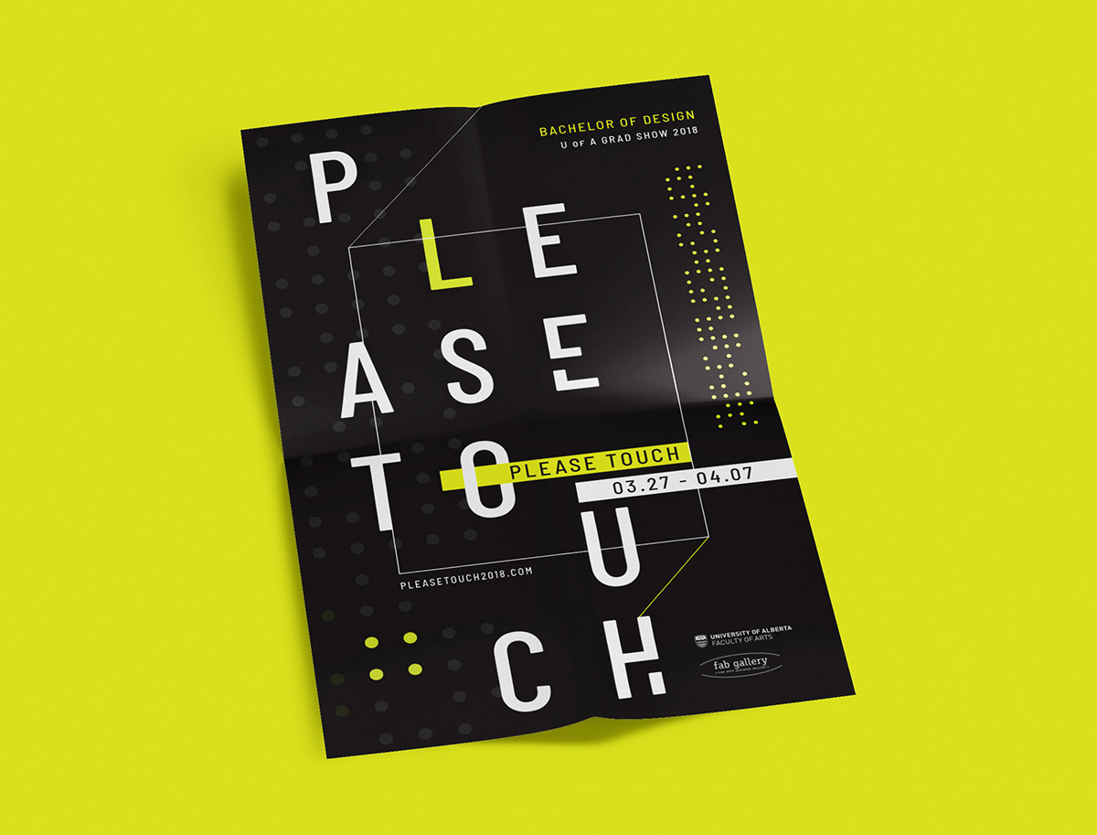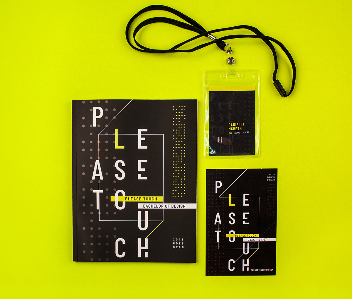 Identity design and print applications for the University of Alberta's Bachelor of Design Grad Show. With an emphasis on communicating the interactivity of the show, the identity was used across all touchpoints, from the website and grad catalogue, to the physical gallery environment. The identity and applications were designed in collaboration with Hilary Zak.