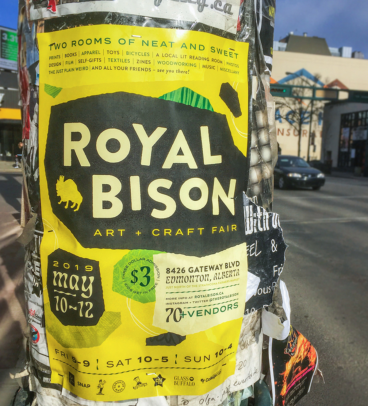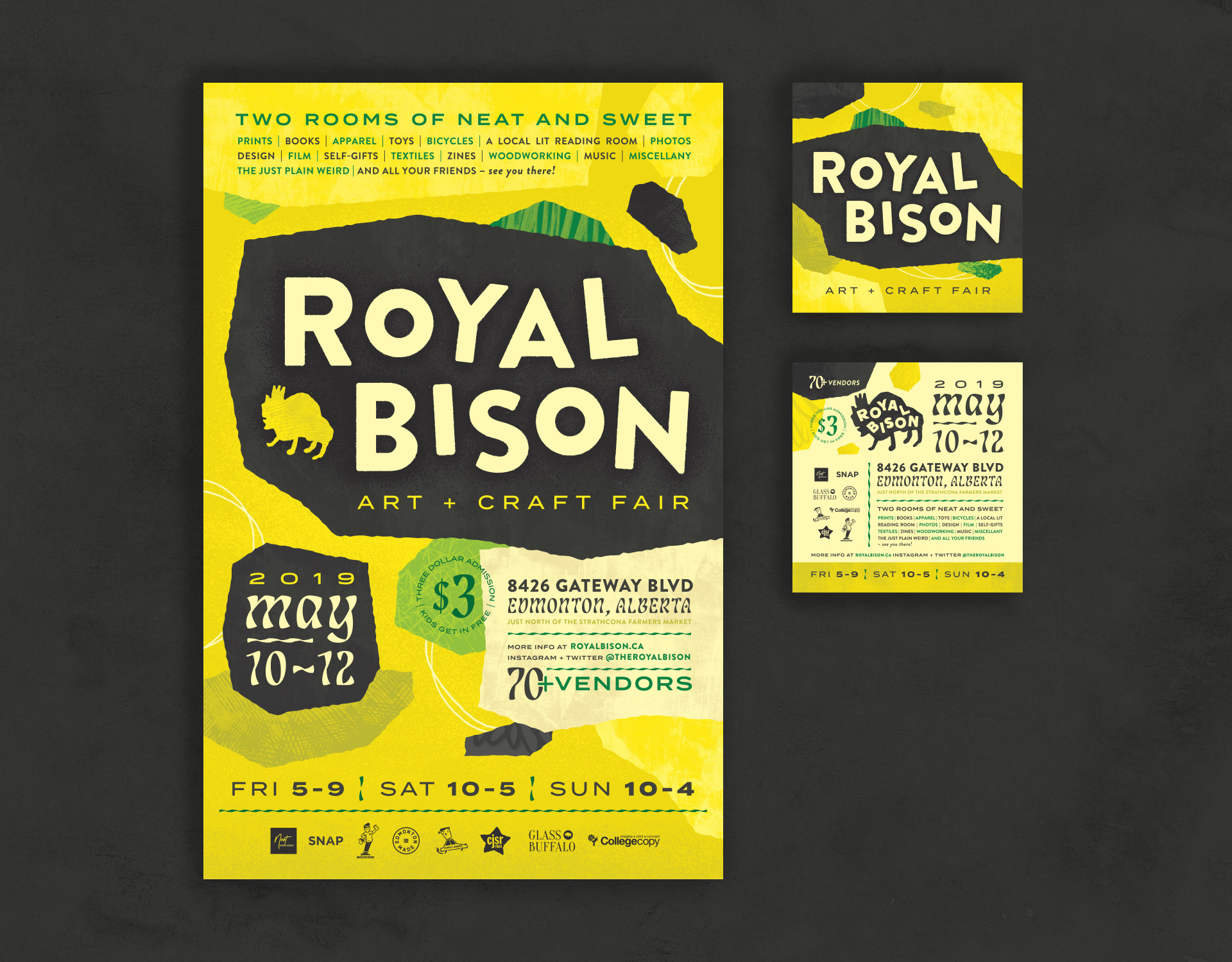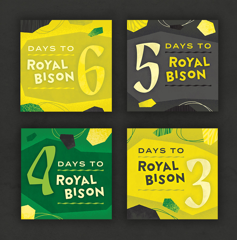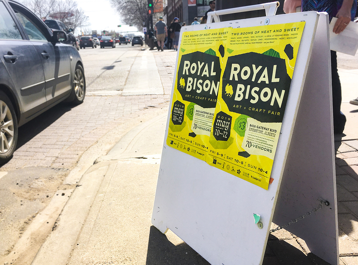 Event branding for the Royal Bison Art + Craft Fair's Spring 2019 market. Royal Bison has been a staple of the Edmonton maker community since 2007. Occurring twice a year, the fair boasts dozens of vendors selling their unique wares and boldly designed products. My work for the season developed a distinct visual for the event while maintaining the zany and effervescent tone the Royal Bison is known for. The materials I created included: social media content, print advertisements, and digital graphics and animations for vendors to share.