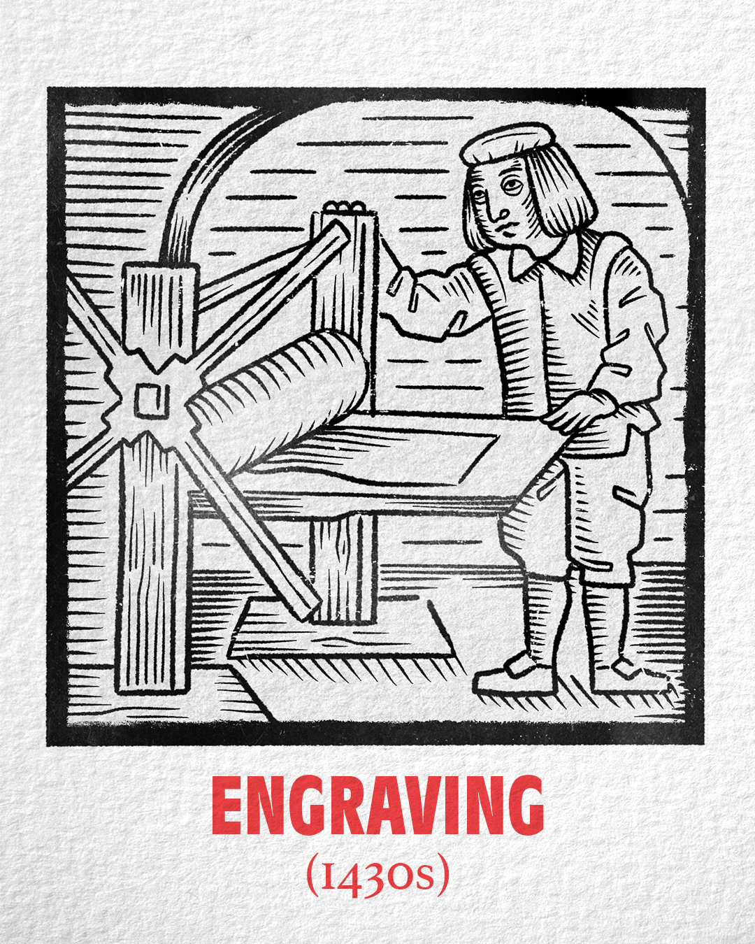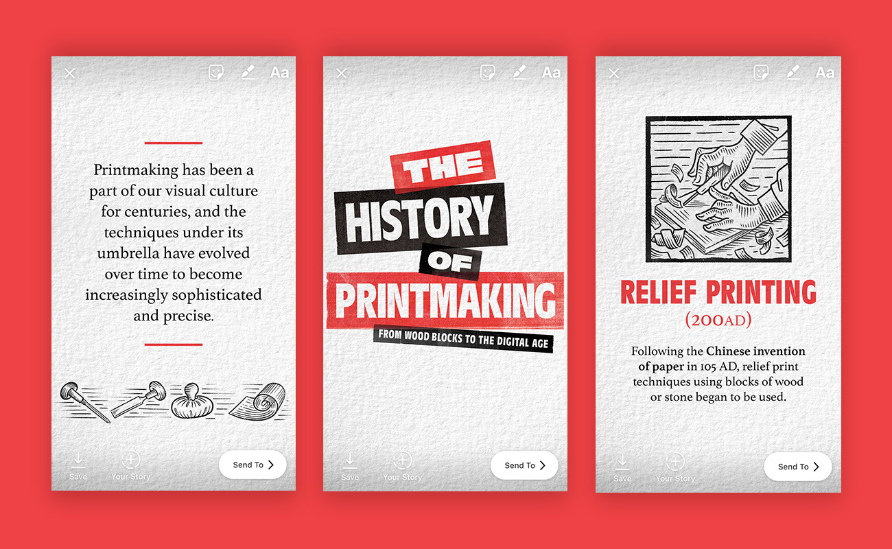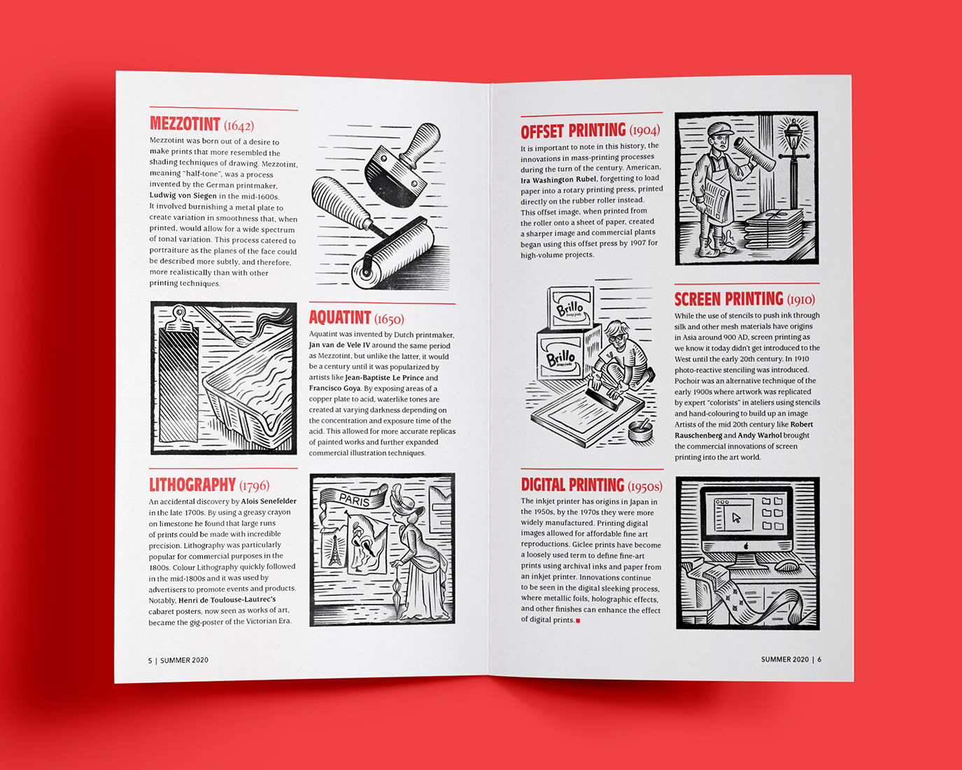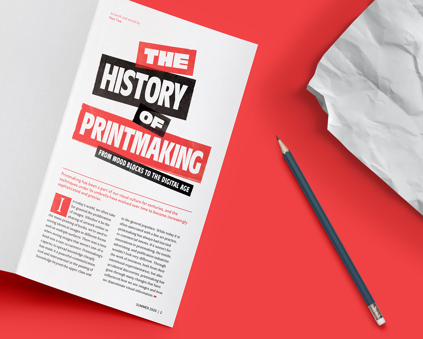 Commissioned by the Society of Northern Alberta Print-artists (SNAP) for their SNAPline publication. I contributed the written article, spot illustrations, and initial layout design (shown here). In addition to the research I undertook for the written assignment, I also studied Renaissance woodcuts to inform the style of the illustrations. The rectangular frames and line work resemble the carved blocks used in relief printing from that period and provide a historical reference point fitting for the timeline narrative of the piece.