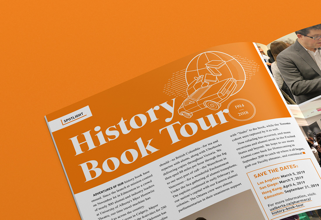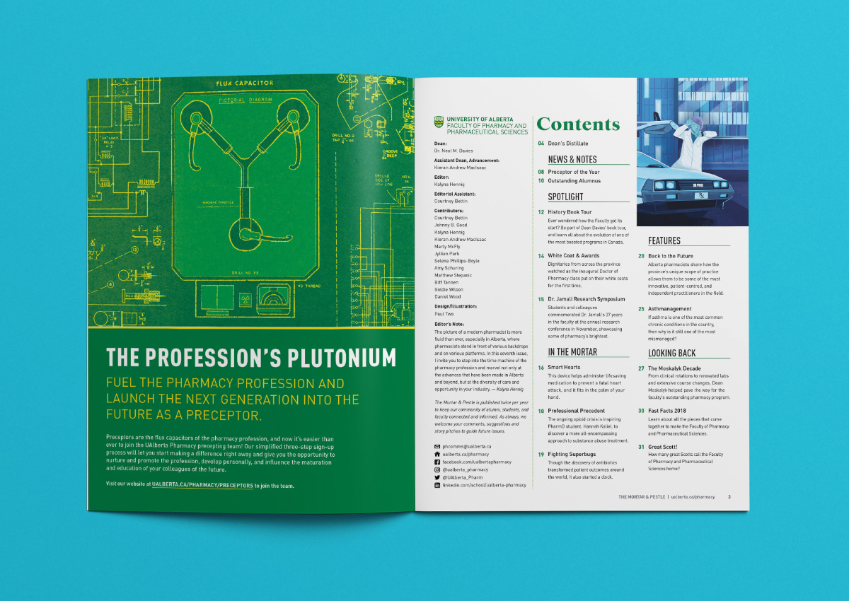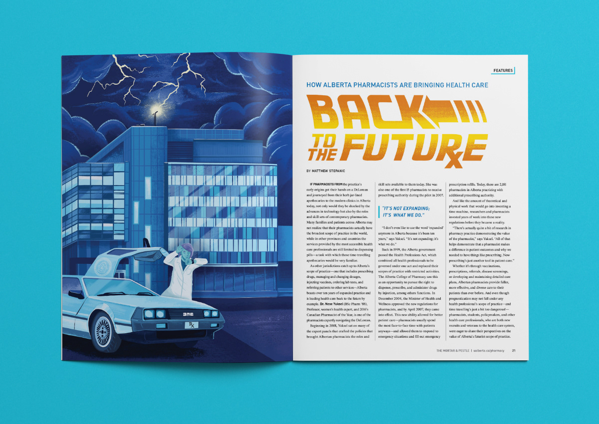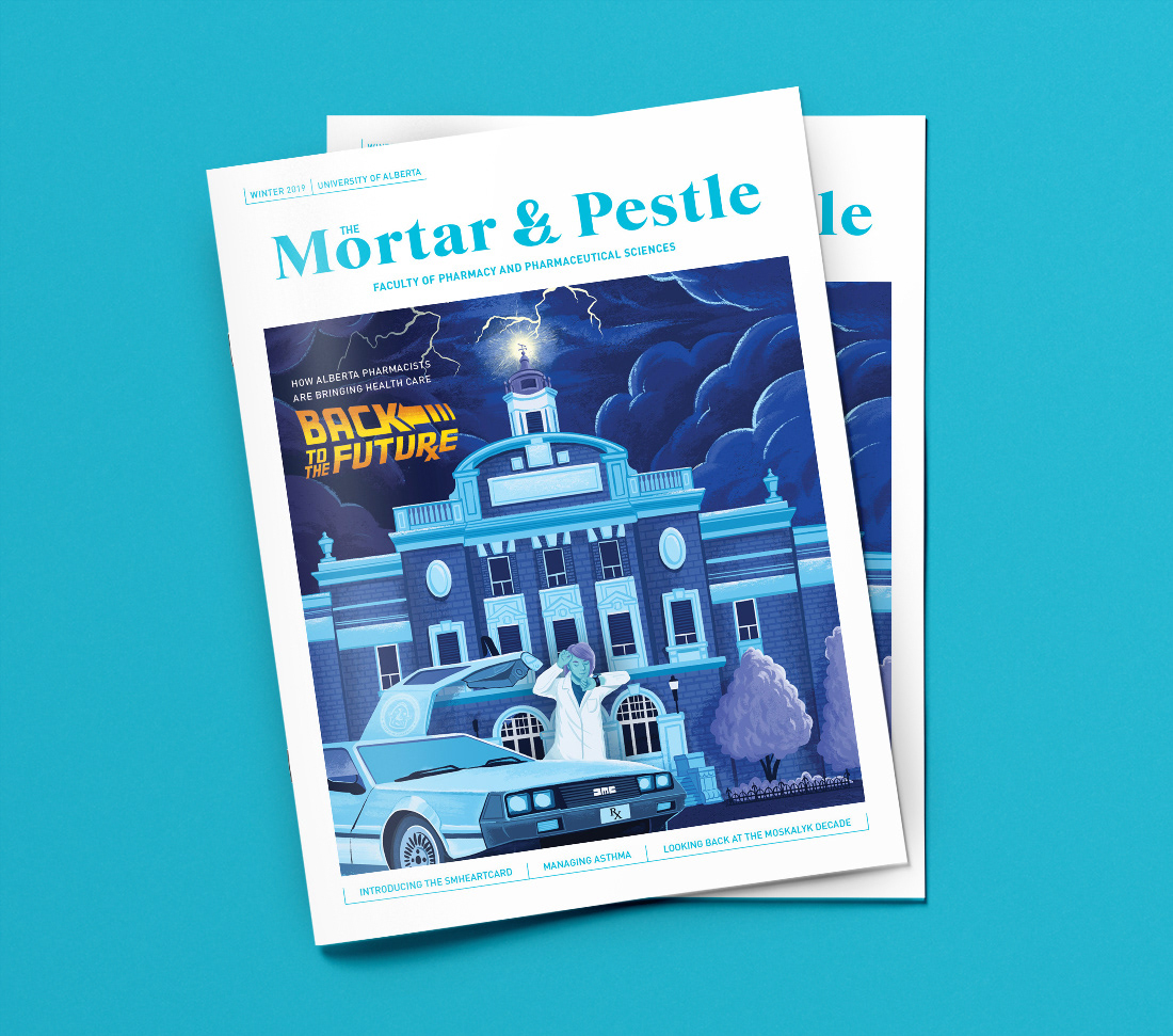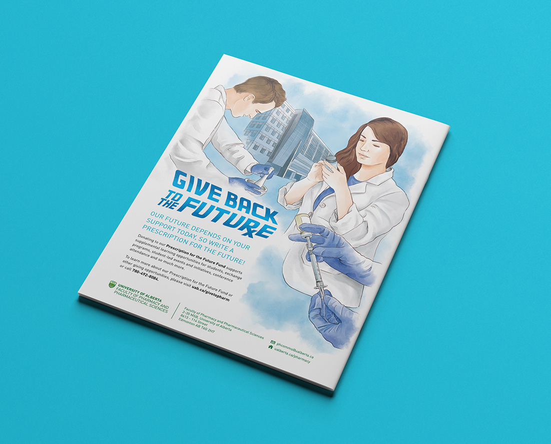 Biannual publication for the University of Alberta's Faculty of Pharmacy and Pharmaceutical Sciences. This issue was specifically themed around "Back to the Future", influencing both the content of the magazine and the graphics I developed. My work included a full redesign of the layout of the magazine, a redesign of the publication masthead, and all the illustrations and editorial graphics within the issue.