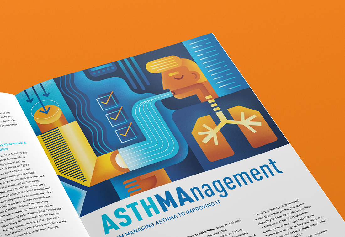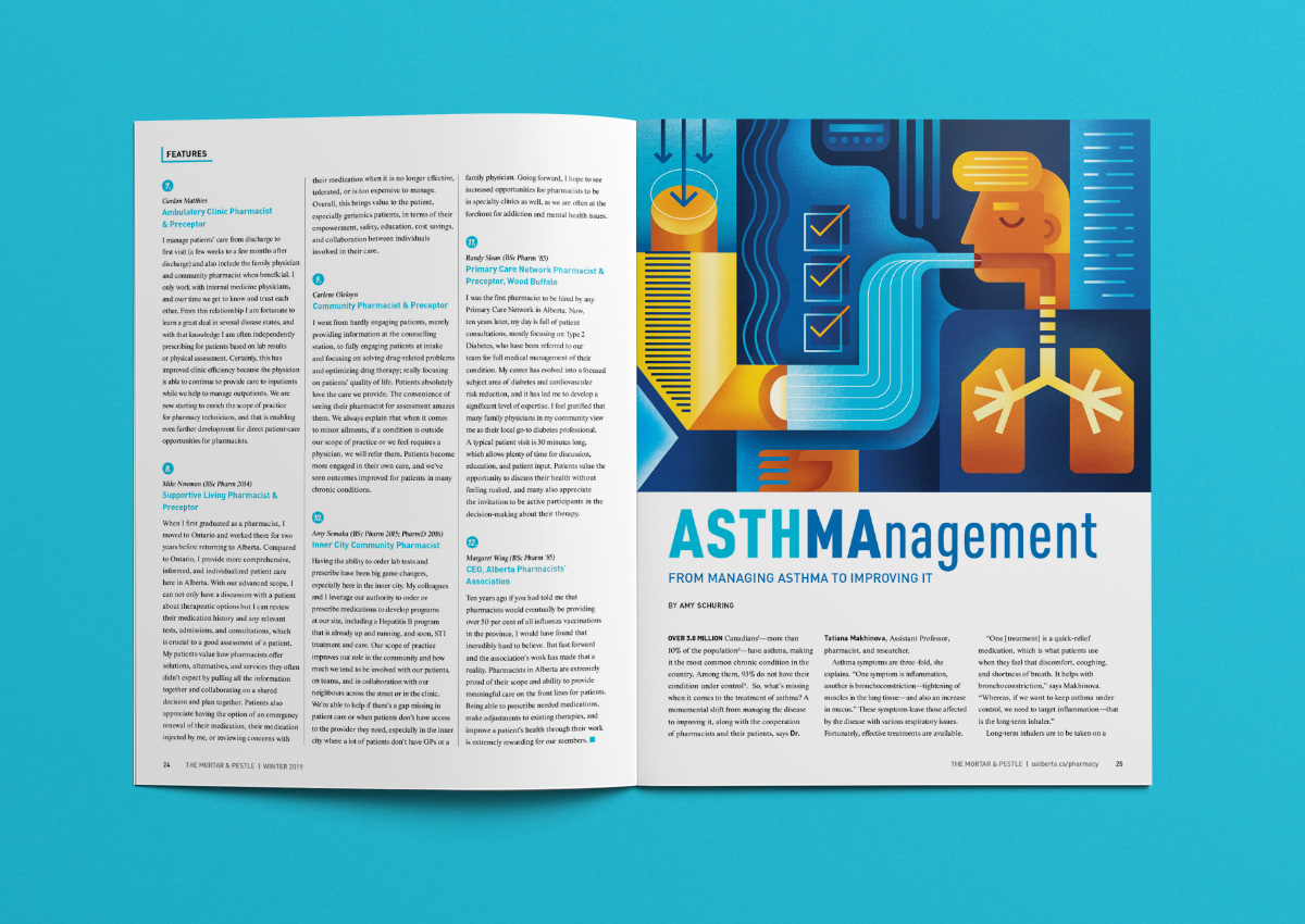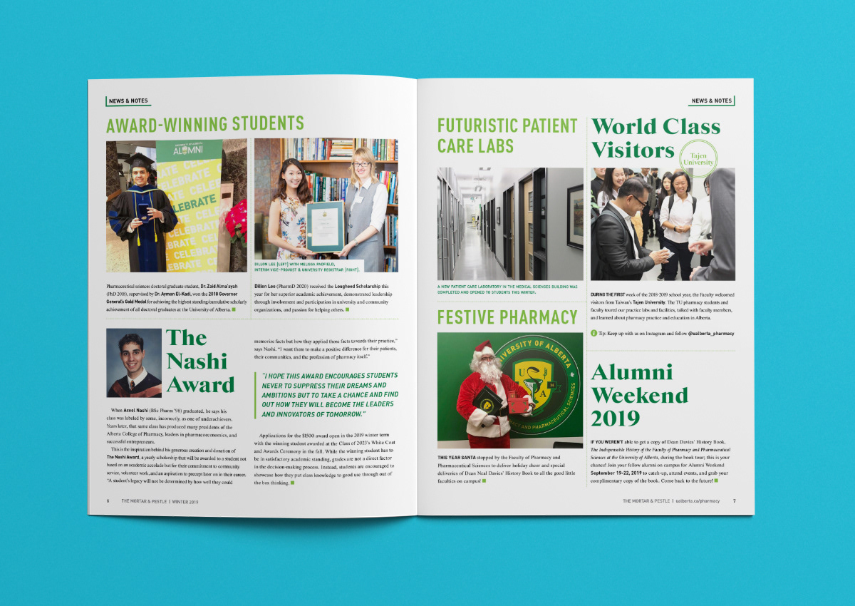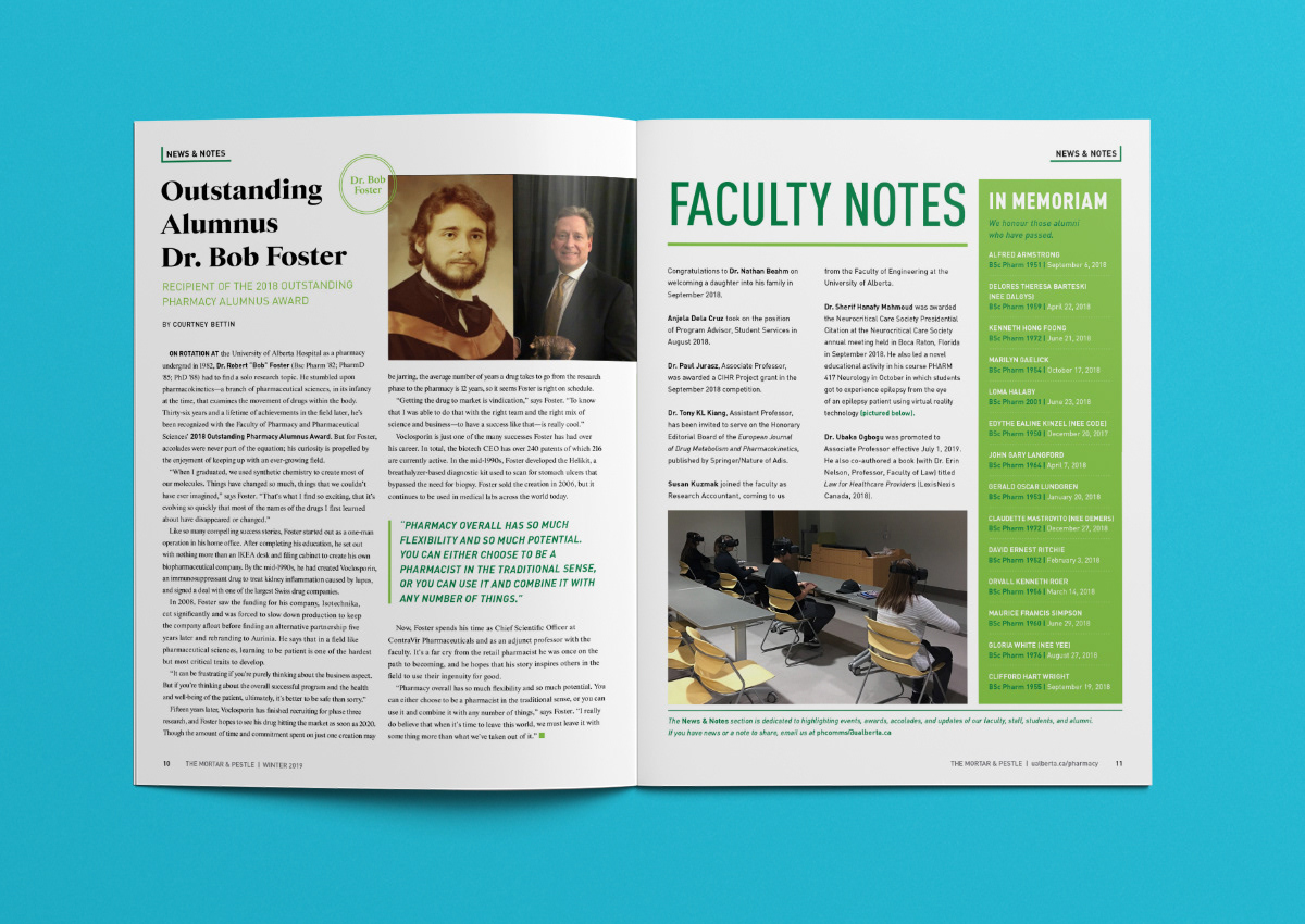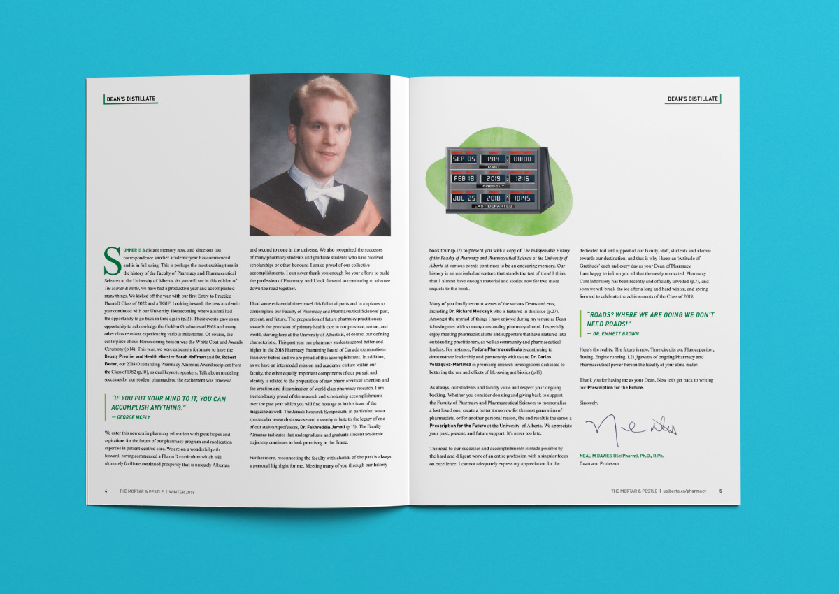 Biannual publication for the University of Alberta's Faculty of Pharmacy and Pharmaceutical Sciences. This issue was specifically themed around "Back to the Future", influencing both the content of the magazine and the graphics I developed. My work included a full redesign of the layout of the magazine, a redesign of the publication masthead, and all the illustrations and editorial graphics within the issue.