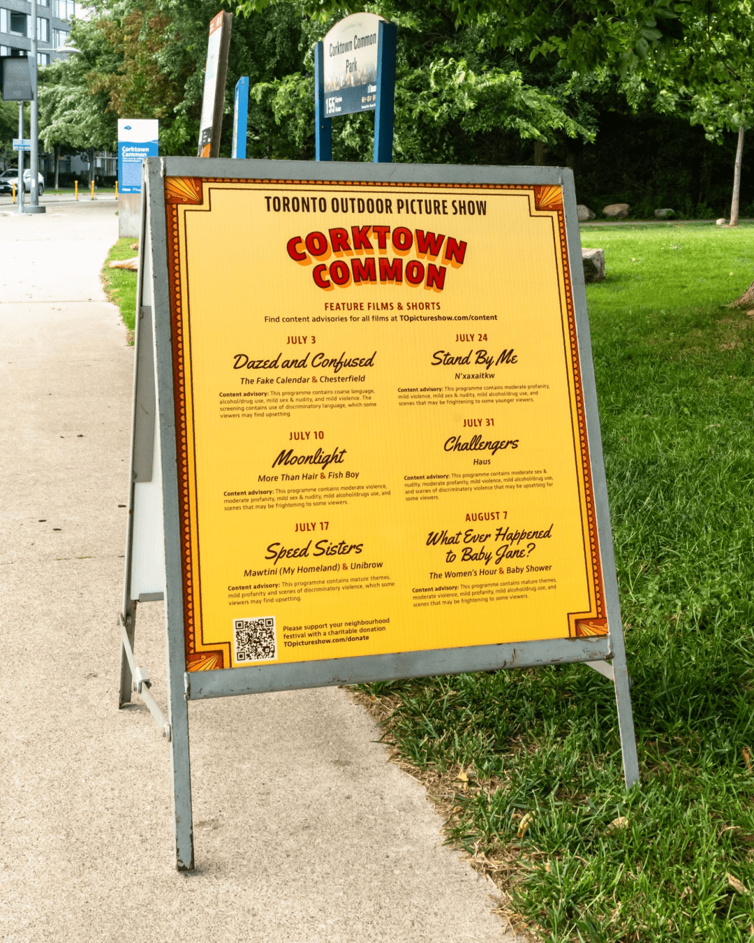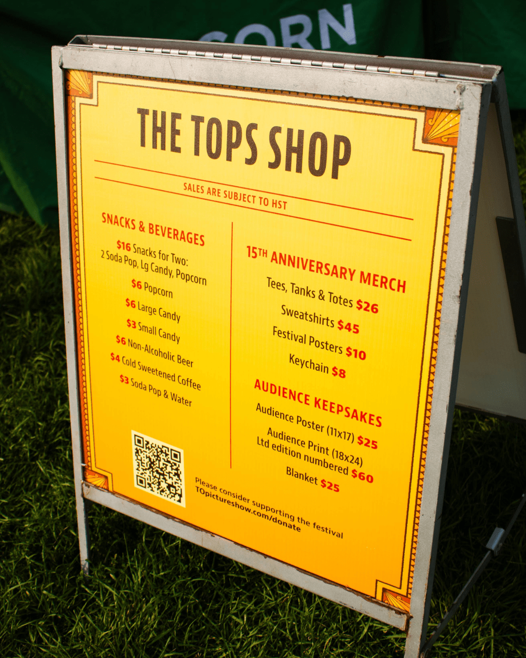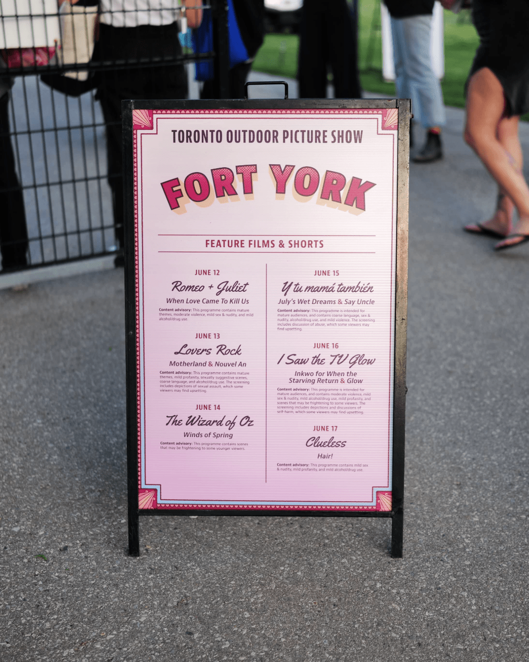 I designed dozens of signs displaying programming details, activities, concessions, and merchandise for sale at the screenings. Postcards and staff/volunteer badges were also created. During the pre-show, hundreds of digital screens were developed, consistent with the colourway of the park.