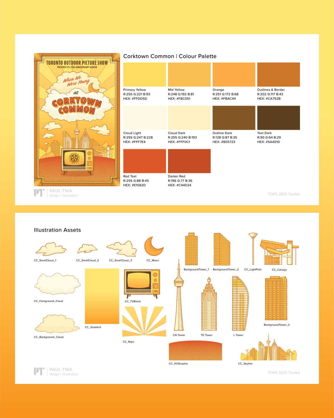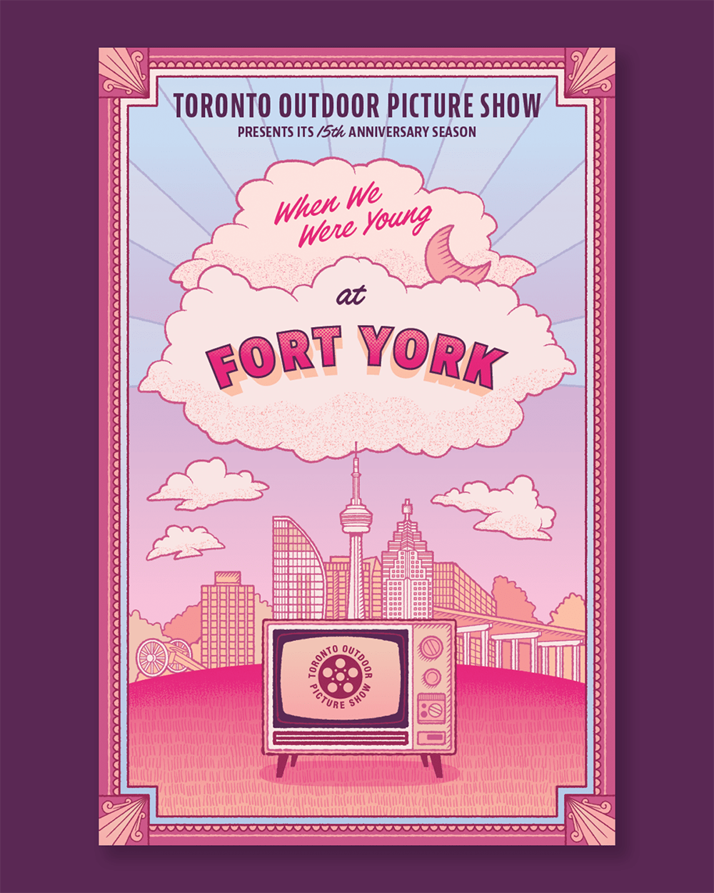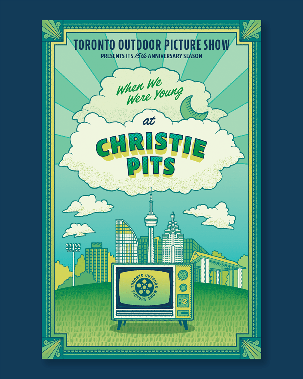 Three colourways were created to differentiate the three parks where TOPS screenings take place: Corktown Common, Christie Pits, and Fort York, each poster features a unique landmark from the parks added to the Toronto Skyline.
